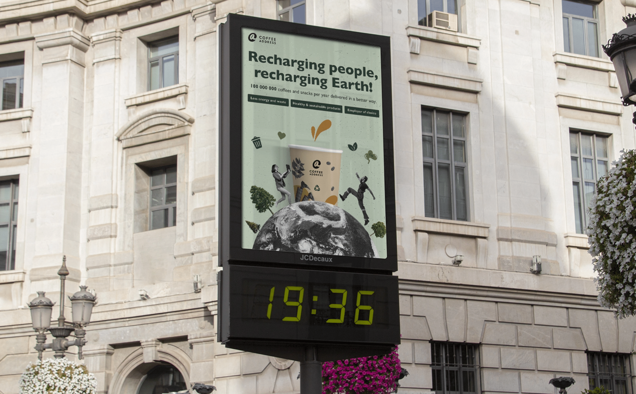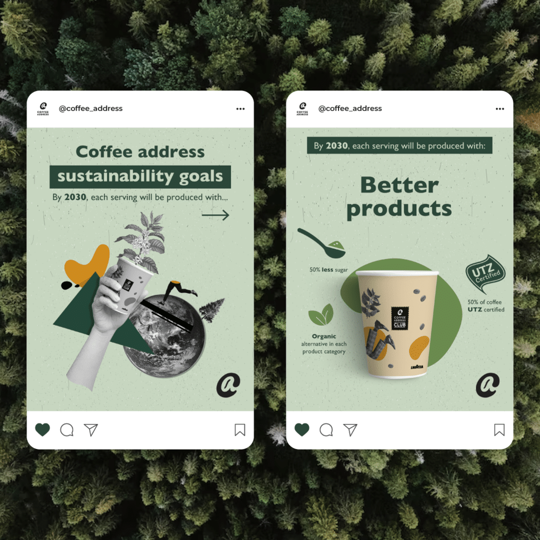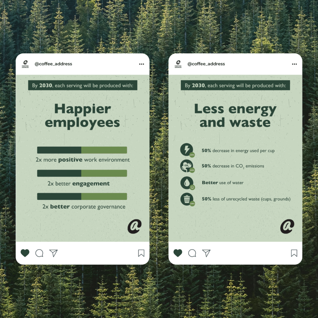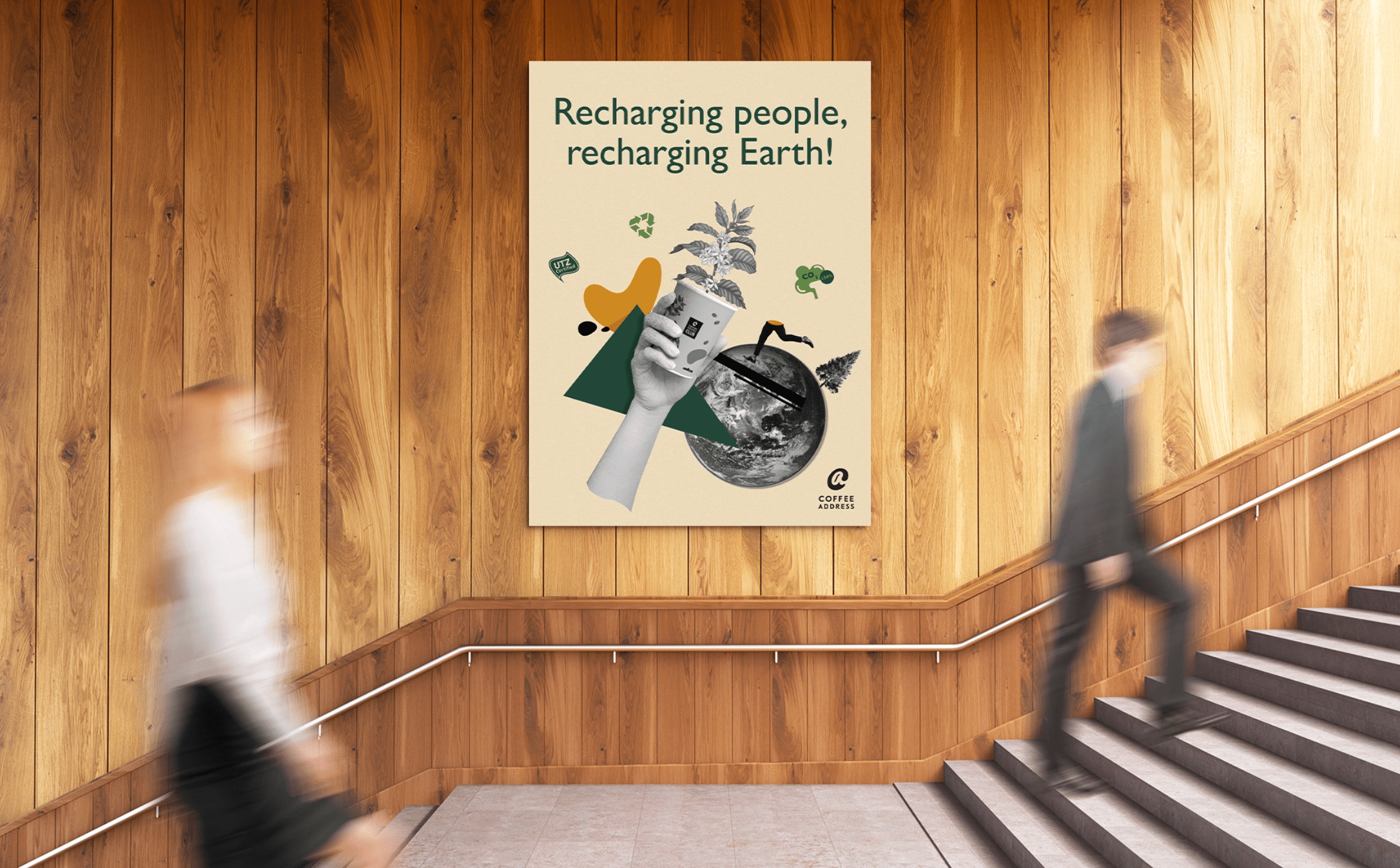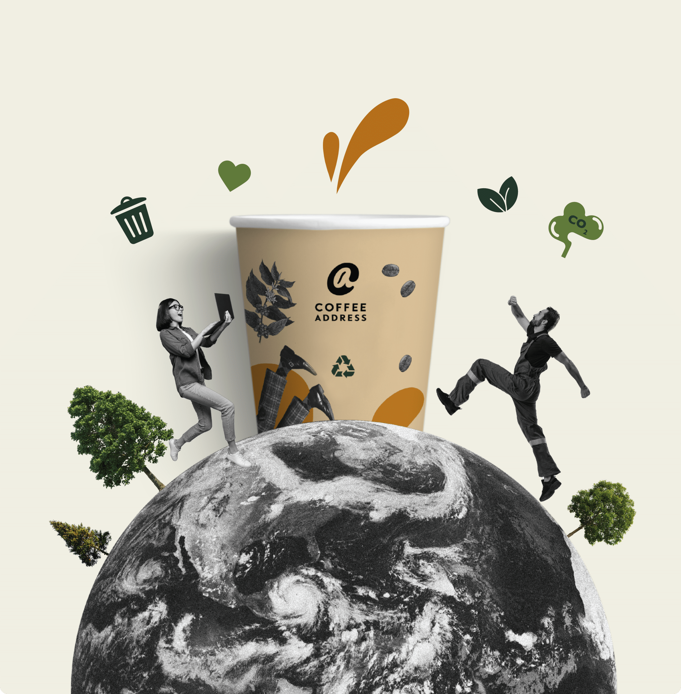 The largest coffee service holding company in the Baltics, Coffee Address, approached us with a task to develop the company’s sustainability program brand and visual identity for use both internally and in communication with customers. As a result, every coffee distributed by ‘Coffee Address’ has become a symbol of a greener approach to nature, the workplace, and employees.