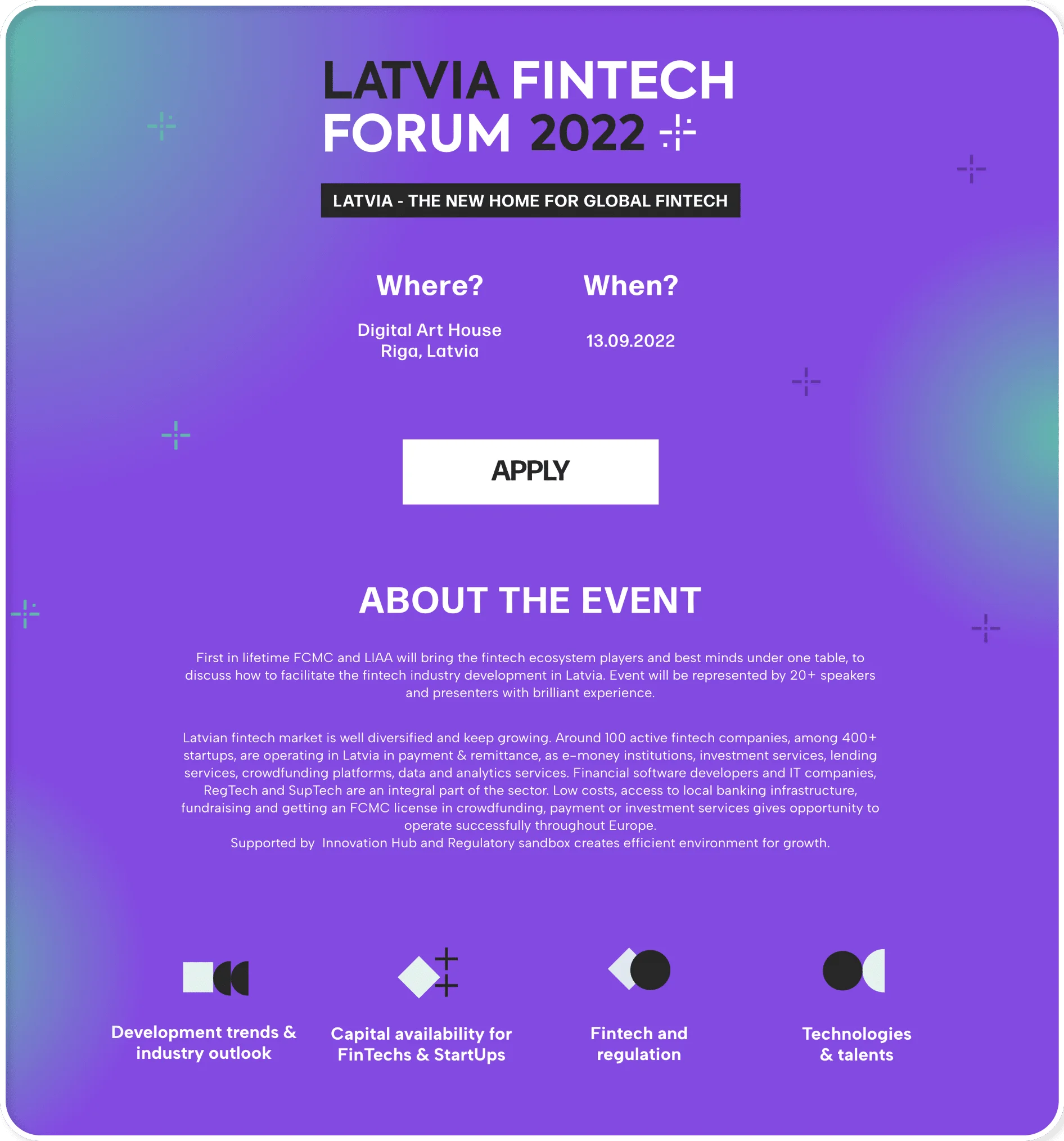 Sadarbībā ar LIAA un FKTK radījām Latvijā pirmās lielās FinTech konferences vizuālo identitāti, konferences mājaslapu ar reģistrācijas funkcionalitāti un tiešraides funkciju, reklāmas materiālu iestrādnes un pasākuma merča un norises vietas (Digital Art House) vizuālo noformējumu. Termiņš bija vairāk nekā saspringts, taču, ja kaut ko apsolām, tad piegādājam!